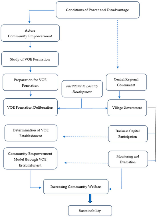 The purpose of community empowerment through the formation of VOE is to strengthen the economy and improve the welfare of the village community. VOE is a village business institution managed by the village community together with the village government. VOE is formed based on the potential owned by the village and in accordance with the needs of the community in solving its problems. The management of a VOE requires an effort to empower the community, carried out by individuals in the community and in the central, provincial, and regional governments as well as in the private sector and university research institutions. This is an element that must be accomplished as stated by Adi (2012) as a process and with the direct active contribution of all those involved [38]. The active role of the community is a manifestation of efforts to improve the economic and social conditions of the community. The flow of developing a community empowerment model in a concise and comprehensive manner can be seen in Figure 3.