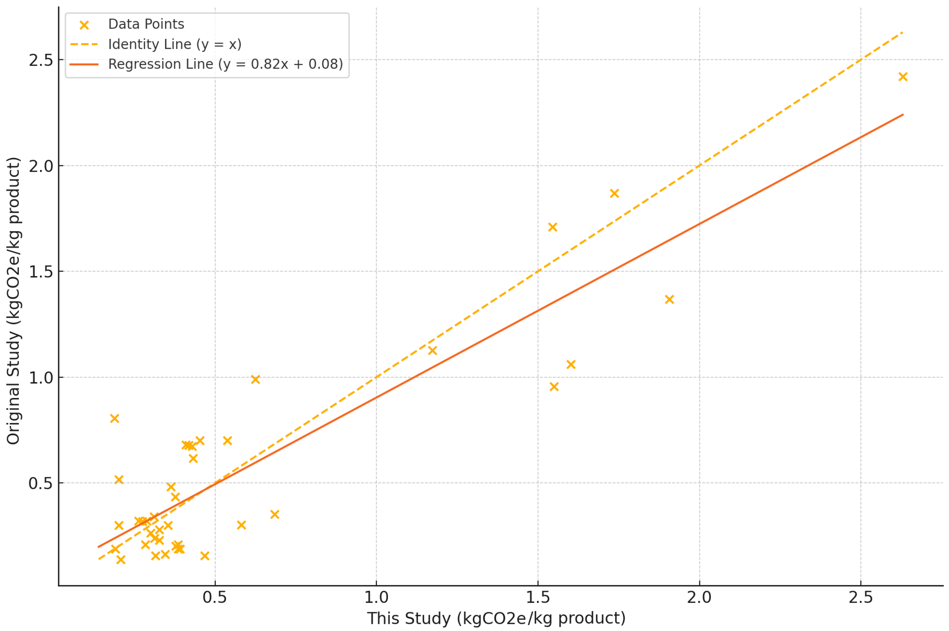 Finally, to assess the consistency between the recalculated emissions and original study findings, a comparative analysis was performed. The final results from this study were plotted against the original reported values, with each point representing a system included in the review. An identity line (y = x) was added to show perfect agreement, while a regression line was fitted to observe general trends and detect systematic deviations. This allowed for a visual and statistical evaluation of potential bias or differences between the original and harmonized estimates.