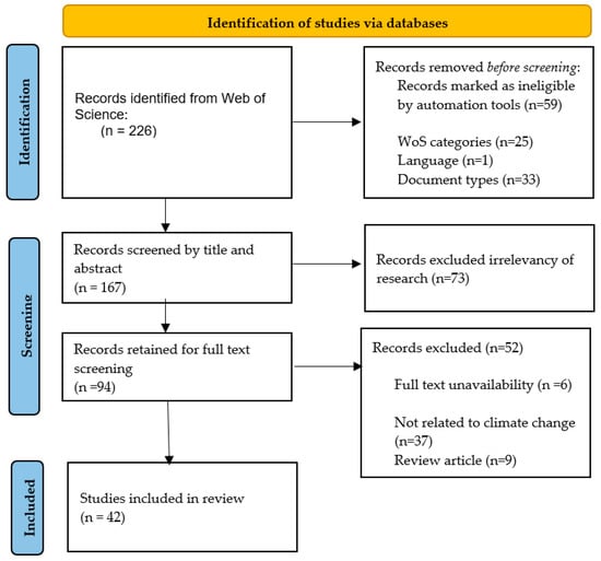 - Initially, 226 publications were identified in the Web of Science database using the search terms “climate change” or “global warming” combined with “tourism” or “travel” and “outdoor recreation”. Automation tools excluded 59 records based on the WoS categories, language, and document types.