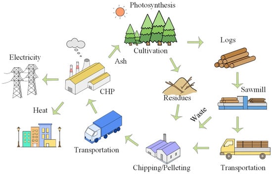 For bioenergy systems, a typical life cycle usually includes biomass production, pre-treatment, conversion, and usage. A simplified cradle-to-grave life cycle scheme of a combined heat and power (CHP) system using woody biomass is shown in Figure 1. The life cycle encompasses the following stages: forestry biomass cultivation; energy acquisition from the sun through photosynthesis and stored as chemical energy; forestry biomass collection and the log transportation; log processing; wood biomass transportation to chipping (pelleting) plant; residue collection and transportation; the processed chip (pellet) transportation; electricity and heat generation in the CHP; electricity and heat delivery; and ash collection and disposal.