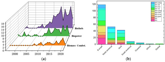 Temporal and geographical distribution of the reviewed bioenergy LCAs. (a) Annual publications of CLAs for biomass combustion, biopower, and biofuels; (b) geographical stacking distributions of reviewed LCAs per bio-technology categories, i.e., biomass combustion, biopower (through biomass combustion, gasification, co-firing, as well as comparative studies), and biofuels (the first, second, and third generations, as well as comparative studies).