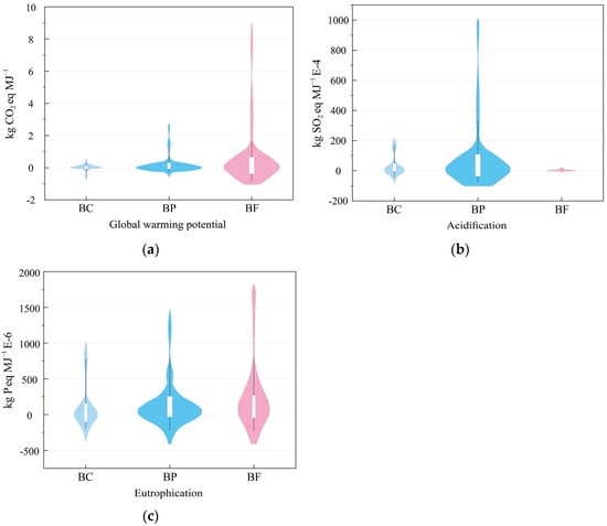 Environmental impacts in terms of (a) GWP, (b) AP, and (c) EP, per FU of biomass combustion, biopower, and biofuels. The width of the violin shape indicates the data distribution within this range.