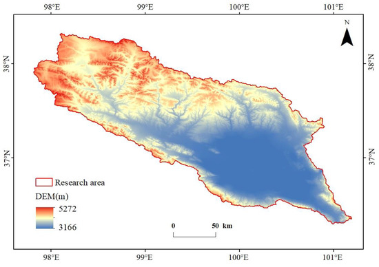 The Qinghai Lake Basin is located on the northeastern edge of the Qinghai–Tibet Plateau, with geographic coordinates ranging from 97°50′ to 101°20′ east longitude and 36°15′ to 38°20′ north latitude, covering a total area of approximately 29,600 km2 (as shown in Figure 1). Qinghai Lake, situated within the basin, is the largest inland saline lake in China, with its surface area accounting for about 16% of the total basin area. In recent years, the surface area of Qinghai Lake has been steadily increasing. Currently, the main lake and its sub-lakes cover a total area of 4441.22 km2, and the lake contains two islands, Haixin Mountain and Sankeshi. In this study, the basin area is defined as the region excluding the lake’s surface area, which is approximately 25,000 km2.