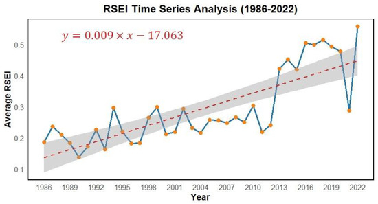 From 1986 to 2022, the Remote Sensing Ecological Index (RSEI) demonstrated a significant upward trend. In the early period (late 1980s to mid-1990s), RSEI values were relatively low and exhibited some fluctuations, but the overall level remained subdued. Over time, particularly after 2000, the annual mean RSEI increased substantially and continued to rise steadily over the subsequent decade. By 2022, it reached its highest level in the observation period, significantly surpassing the levels observed in the initial stage.