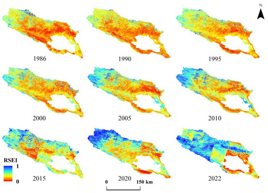 From 1986 to 2022, the Qinghai Lake Basin’s Remote Sensing Ecological Index (RSEI) experienced significant spatial changes (as shown in Figure 3). Observing the spatial patterns over the time series: