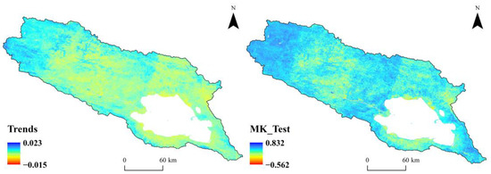 The Mann–Kendall trend test is a statistical method used to analyze the temporal variation trends in time series data [20] and is suitable for non-normal data distributions, hydrological studies, and vegetation change research. In this study, the Mann–Kendall trend test is used to analyze the RSEI change trend in the Qinghai Lake Basin from 1986 to 2022. At a significance level of α, if , the change is considered significant; otherwise, the change is considered non-significant.