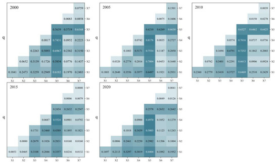 Interactive detection results for different years: X1 represents the annual average precipitation; X2 represents the annual average temperature; X3 represents slope; X4 represents aspect; X5 represents elevation; X6 represents land use; and X7 represents population density (The darker the colour, the stronger the correlation).