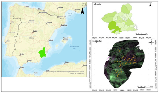 The geographical location of the study area is in the Region of Murcia, in a district of Lorca (Nogalte), Spain (see Figure 2). The climate of the region is semi-arid and temperate, with an average annual temperature of 17.6 °C and annual rainfall of approximately 312 mm. The topography of the region is characterised by a relatively rugged geomorphology, with higher elevations in the northeast and southwest and lower elevations in the northwest, ranging from 600 to 800 m. The region’s moderately fertile soil is well suited to almond cultivation.
