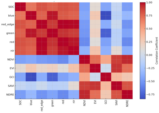 To establish a relationship between the soil organic carbon (SOC) content and the drone image bands, we used machine learning statistical analysis (Table 1) based on the correlation matrix (Figure 4). This analysis allowed us to determine the relationship between SOC measured in the laboratory and the drone image bands, including NIR, red, red edge, blue and green, as well as vegetation indices such as NDVI, EVI, GCI, SAVI and NDRE. Pearson correlation coefficients (r) were calculated to assess the degree of association between the independent variables and SOC content. The correlation matrix, as shown in the heatmap, indicates significant relationships between the spectral bands, vegetation indices, and SOC content. The heatmap visually highlights the strength and direction of these correlations, with warm colours representing strong positive correlations and cool colours representing negative correlations. Red (r = 0.814), Red_edge (r = 0.812), and NIR (r = 0.794) show strong positive correlations with SOC. These bands are highly associated with variations in soil organic carbon due to their sensitivity to surface properties, including organic matter. Blue (r = 0.690) and green (r = 0.770) show moderate to strong correlations with SOC. Although these bands are less sensitive to organic matter than NIR or Red_edge, they still contribute to the detection of soil characteristics.