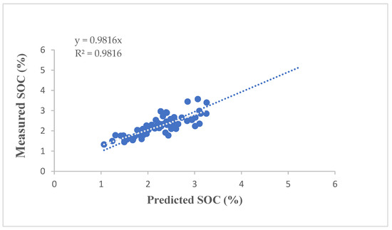 Graph of SOC predicted by PLSR from spectral measurements as a function of SOC in the laboratory. Predicted versus measured Soil Organic Carbon (SOC) values. The blue points represent individual sample observations, and the dotted line indicates the linear regression model fitted to the data (y = 0.9816x, R2 = 0.9816), confirming the model’s high predictive performance.