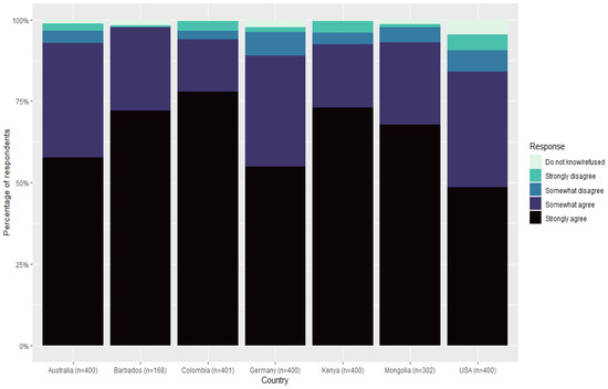 Respondents were asked “which of the following statements best describes your opinion: (a) We must protect the Earth’s land, water and wildlife because all species have a right to live, regardless of the usefulness to humans or (b) We must protect the Earth’s land, water, and wildlife because they provide many benefits that support human prosperity, health, and well-being” and were asked to rank the strength of this choice as “strongly”, “somewhat”, or “don’t know”. A majority of the respondents in five of the seven countries “strongly” or “somewhat” favored the response “We must protect the Earth’s land, water and wildlife because all species have a right to live, regardless of the usefulness to humans”, with respondents from Colombia, Germany, and Australia showing the greatest preference (57.5%, 55.2%, 54.0%, respectively) (Figure 4). The majority of respondents in Barbados (58.3%) and the USA (51.7%) “strongly” or “somewhat” favored the response “We must protect the Earth’s land, water, and wildlife because they provide many benefits that support human prosperity, health, and well-being”. For five of the seven countries (Australia, Colombia, Kenya, Germany, Mongolia), engaged citizens were slightly more likely select the “all species have a right to live” option, with no difference in responses between engaged citizens and the general public in the other two countries (Appendix B, Table A1).