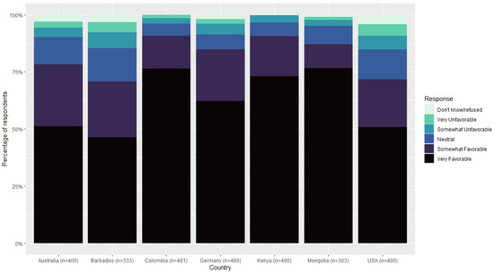 Respondents were provided the following information: “Various governments and organizations are coming together to set a goal to protect 30% of the Earth’s lands, freshwater areas, and oceans by 2030. This initiative seeks to create and expand protected areas, establish conservation targets, invest in science, and inspire conservation action around the world” and were then asked, “Based on this information, please rate your overall impression of this initiative on a 0 to 10 scale, where 0 means you have a very unfavorable impression and 10 means you have a very favorable impression.” Over half of the respondents in all countries except Barbados rated the proposed 30 × 30 initiative as “very favorable” (categories 10–8) (Figure 2), with 77% in Mongolia and 76% in Colombia giving this rating. Over 70% of respondents from all countries had a generally favorable (combining ratings 10–6) impression of the initiative, ranging from Colombia with the highest positive impression at 91% and Barbados who had the lowest positive impression at 73%. No country had more than 12% of respondents considering concept “unfavorable” (Barbados had a 7% “somewhat unfavorable” and 5% “very unfavorable” response). Engaged citizens rated this statement as more favorable than the general population, perhaps demonstrating a higher level of awareness, education, and/or engagement on the issue of environmental protection (Appendix B, Figure A2).