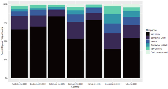 The likelihood of residents supporting their national government to commit to protecting 30% of their nation’s lands and oceans by 2030 (10–8 = very likely, 7–6 = somewhat likely, 5 = neutral, 4–3 = somewhat unlikely, and 2–0 = very unlikely).