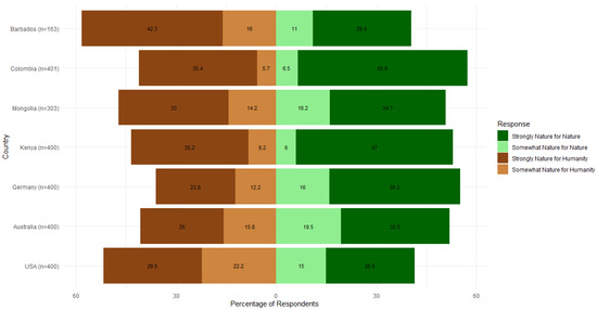 | Country | Strongly Nature for Nature | Somewhat Nature for Nature | Don’t Know/Refused | Somewhat Nature for Humanity | Strongly Nature for Humanity | ||||||||||