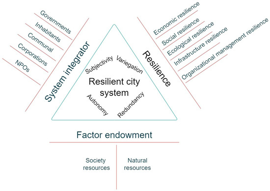 As a result, a resilient city system should comprise four principal elements [39], based on the connotation of resilient city systems and the key principles of CAS theory.