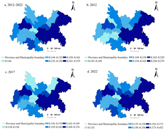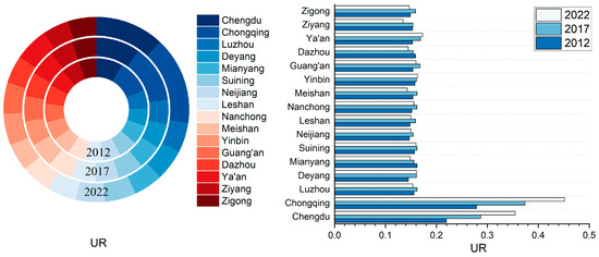 - Between 2012 and 2022, the UR of the CCEC transitioned from a “single-core” model centered on Chongqing to a “dual-core” model featuring both Chongqing and Chengdu. The overall level of UR in the study area improved, exhibiting a spatial differentiation pattern with two prominent wings and a concave center. Additionally, the spatial shaping capacity of UR was strengthened by the influence of cities in southern Sichuan.