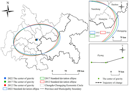 From 2012 to 2022, the standard deviation ellipse of the twin-city economic circle in the Chengdu–Chongqing region exhibits a vertical spatial pattern with an east–west orientation. The alteration in the standard deviation ellipse area indicates that the ellipse area has expanded by 648,348,262.06 km2, exhibiting a rising trajectory in the total area encompassed. In consideration of the long and short semi-axes, the length of the long semi-axis increased by 2892.4 m from 2012 to 2017 and by approximately 1274.94 m from 2017 to 2022, for a total increase of 4167.34 m. This suggests that there is a trend of increasing urban resilience that is dominated by traction effects between the east and west in the direction of the east–west principal axis. The length of the short half-axis shrinks by a total of about 1456.41 m between 2012 and 2022, suggesting that the urban resilience of the north–south has developed in a manner characterized by a dominant braking effect. With regard to the center of gravity of urban resilience, the coordinates of the center of gravity are situated between 105°46′~105°47′ E and 30°25′~30°27′ W, and are consistently located within the boundaries of Suining city. Between the years 2012 and 2017, the center of gravity shifted to the northeast by 6.282 km, followed by a further shift of 6.448 km to the southwest. From the azimuthal angle of the ellipse, it rotated clockwise from 2012 to 2022, indicating that southern cities are increasingly capable of shaping the spatial pattern of urban resilience and that the traction effect on the standard deviation ellipse is progressively more pronounced, but the potential for power is weakening.