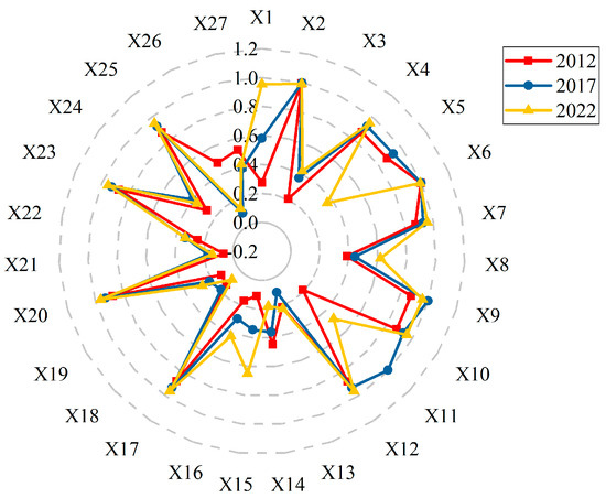 (2) Economic factors. The economy is a crucial basis for fostering social stability, infrastructure improvement, and the proper functioning of organizational management capabilities. The number of above-scale industrial enterprise units (X2) is closely correlated with local tax revenue and industrial layout, and the increase in local financial tax revenue and the optimization of industrial layout have a profound impact on regional economic growth and employment activities. The balance of deposits per capita in financial institutions (X6) is a concentrated reflection of the region’s comprehensive strength and development potential as well as a prerequisite for promoting consumption and stimulating market vitality. During the period of 2012–2022, the influence of these two remained consistently in the first and second places, suggesting that differences in the level of urban resilience are strongly influenced by economic stability and growth potential. The share of the tertiary sector in GDP (X5) is indicative of the extent of socioeconomic transformation and optimization, and its impact on the ranking in 2017 declined, subsequently falling out of the top ten in 2022. Local general budget revenues (X4), which reflect both the financial strength of local governments and the responsiveness of the region to ensure the normal functioning of the economy, society, and other systems, remained in sixth place in both 2012 and 2017 and declined to ninth place in 2022. The first appearance of GDP per capita (X1), which reflects the overall level of socioeconomic development, was in 2022, where it was in the fourth position, suggesting that its role in driving up the resilience capacity of the city is beginning to emerge.