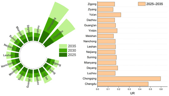 Temporal changes in urban resilience of the CCEC in 2025, 2030, and 2035.