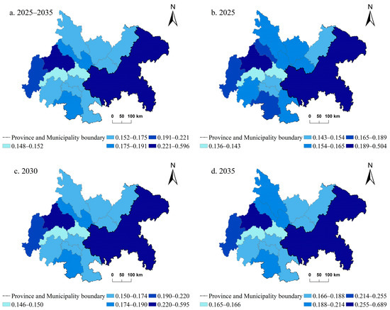 From the perspective of 2025, 2030, and 2035, the chronological changes in each region (Figure 9), the CCEC, and the level of urban resilience show a gradual and consistent growth trajectory. The growth of urban resilience in each region is more consistent; in Chengdu and Chongqing, the urban resilience center status is prominent; the “dual-core” structure is obvious; and the inter-regional development rate is relatively unbalanced, but the regional central city polarization effect is prominent. The growth rate of the Chongqing–Chengdu “dual-center” remains at 18.5%, 15.8%; Chengdu, Chongqing, and Ya’an city resilience is higher than the average value of the resilience of cities in the CCEC; Ziyang City, Meishan City, Zigong City, and other cities’ resilience value with the change in the year of the study fluctuates with an upward trend; but in the overall Chengdu–Chongqing City Cluster, the level of resilience needs to be further improved.