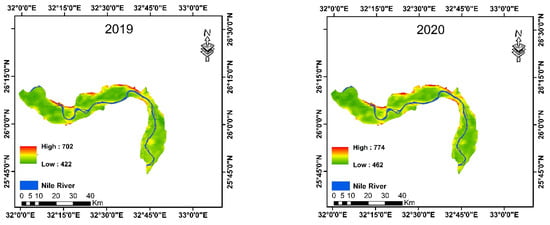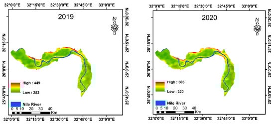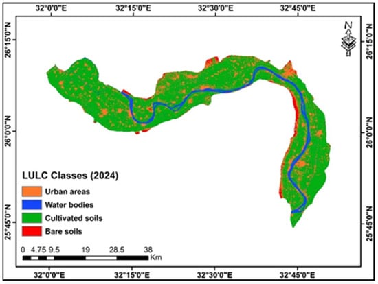 The research area’s climate is classified as dry, which is typical of North Africa, and is marked by scorching summers, mild winters, and little to no precipitation. In general, the relative humidity ranges from 16% to 41%, and the average temperature falls between 16.6 °C to 32.7 °C (https://www.weather-atlas.com/en/egypt/qena-climate, accessed on 6 January 2025). According to Abdelsamie et al. [20], the study region primarily consists of the following four kinds of distinct land-uses, as shown in Table 1 and Figure 2: cultivated soils (65.72%), bare soils (3.90%), water bodies (7.27%), and urban areas (23.1%).