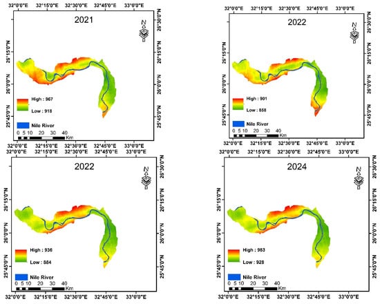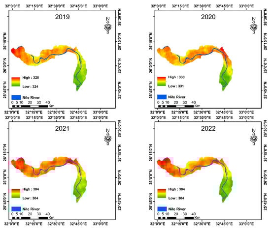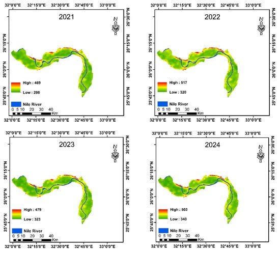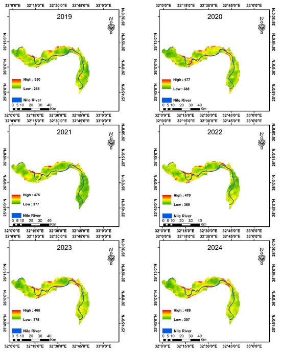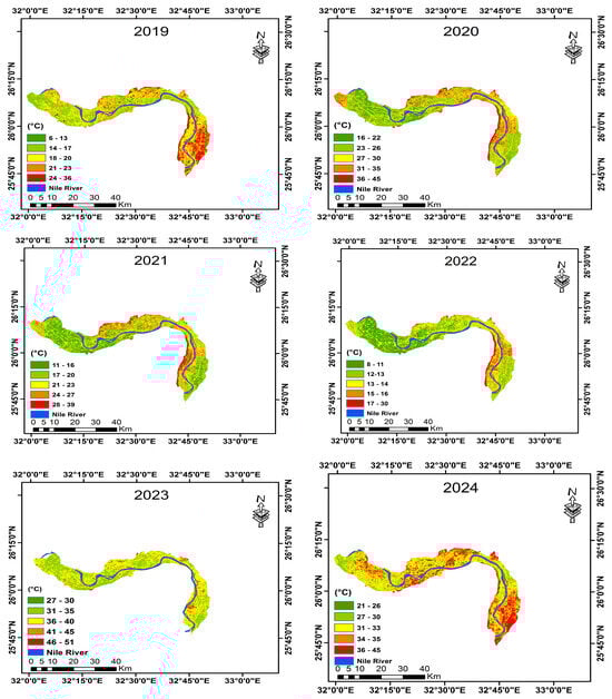 Figure 4. The distribution of LST in the study area for the period from 2019 to 2024.