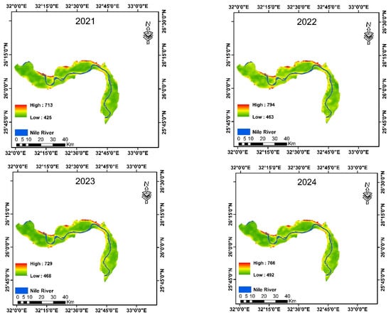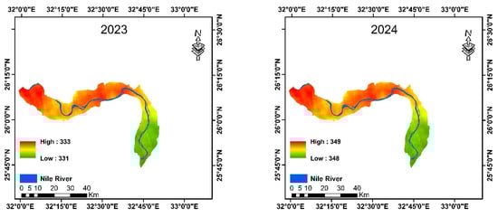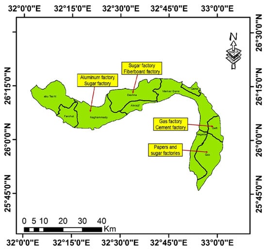 The third governorate from the southern border of Egypt, following Aswan and Luxor, is Qena, which is situated between latitudes 25°13′ to 26°15′ N and longitudes 32°00′ to 32°55′ E. Figure 1 illustrates its borders: Sohag Governorate, the New Valley Governorate to the west, the Red Sea Governorate to the east, and Luxor Governorate, which broke away from Qena in 2010, to the south. Of the approximately 9565 km2 that make up the Qena Governorate, 1348.32 km2 (13.50%) is located in the Nile Valley (http://qena.gov.eg/Default.aspx, accessed on 6 January 2025). As the primary geographical feature of Qena Governorate, the Nile River flows 162 km across the valley from south to north, dividing the governorate’s territory to the east and west (http://qena.gov.eg/Default.aspx, accessed on 6 January 2025). Administratively, the Qena Governorate is separated into nine local units, which are Abu Tesht, Farshout, Nag Hammadi, Deshna, Alwakf, Qena, Keft, Quos, and Nagada, as well as one new urban community and 112 continuing villages. A total of 3,224,573 people were living in the Qena Governorate, with 80.3% of them residing in rural regions and 19.7% in urban areas. The Qena Governorate is one of the most densely populated governorates. The Qena Governorate is among the governorates that have a primarily agricultural economy. Sugar cane and bananas are grown in the province along with wheat, corn, vegetables (tomatoes), palm trees, lucerne, sesame, and a few fragrant and medicinal plants. The primary crop is sugar cane; the second-most important winter crop is wheat; and the second-most important summer crop is maize (https://www.eeaa.gov.eg/Uploads/Reports/Files/20221128214734177.pdf, accessed on 6 January 2025).