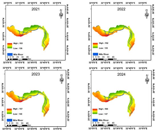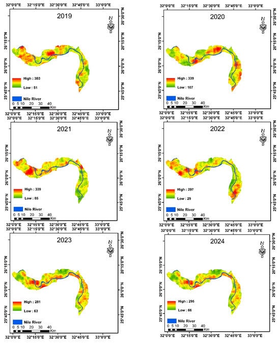 The complex mixture of particles known as particulate matter (PM) can be solid, liquid, or both. They differ in size, composition, and place of origin. Region, season, day, weather, and other variables all affect the precise makeup and size distribution of PM [113]. Total suspended particulates (TSP), PM10 (particles with a diameter less than 10 μm, seen near roads and dusty industries), PM2.5 (particles with a diameter less than 2.5 μm, seen in smoke and haze), and ultrafine particulates (UFPs) (particles with a diameter less than 0.1 μm, or PM0.1) are the four categories into which PM can be separated [113]. The AOD-PM2.5/PM10 empirical–statistical models generated by [78,79] were used in the current investigation to estimate the concentrations of PM2.5 and PM10. The yearly average PM2.5 AQI ranged from a low of 283 to a maximum of 517 between 2019 and 2024 (Figure 5). Based on this, the area is classified as very unhealthy to hazardous (Table 3). In contrast, the PM10 AQI ranged from 422 to 794, indicating the risks associated with this pollutant (Figure 6). The primary sources of PM include burning solid waste and agricultural waste, dust and sand storms, and emissions from vehicles and industries [114]. Three sugar factories, one spinning and weaving mill, and the Aluminium Complex—one of the largest industrial facilities in the Middle East—are all located inside the governorate. Two industrial zones are also located inside the governorate; the first is located at Qaft Markaz, a group of villages in Kalaheen. The nonwoven fabric plant, the antibiotic factory, the food projects, and the plastics industries are also among the most significant undertakings. Investors are encouraged to launch their projects in the second industrial zone, Yahaw in Naggâ Hamady, which has the necessary infrastructure.