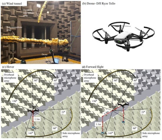Schematics of the experimental setup in the aeroacoustic facility with the far-field microphone arrays for (a) the anechoic chamber (b) Tello quadcopter, (c) hover flight, and (d) forward flight of the Tello drone.