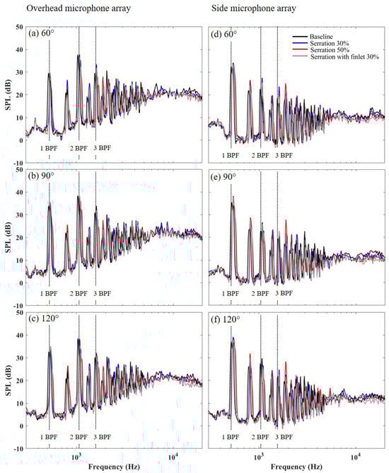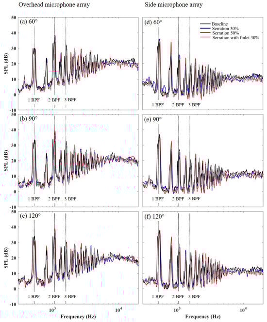 Far-field acoustic spectra of the drone at hover flight using the baseline, serration-only, and serration–finlet blade designs, measured from the overhead microphone array (left column) at = 60°, 90°, and 120° (a–c) and the side microphone array (right column) at 60°, 90°, and 120° (d–f).
