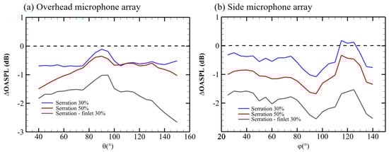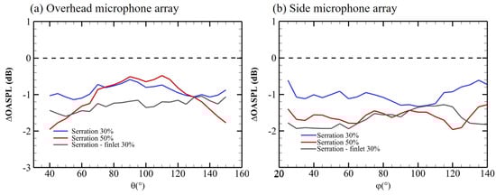 Differences in overall sound pressure level, , at mid-to-high frequencies between the baseline, serration-only, and serration–finlet blade designs measured from (a) the overhead microphone array and (b) the side microphone array for hover flight.