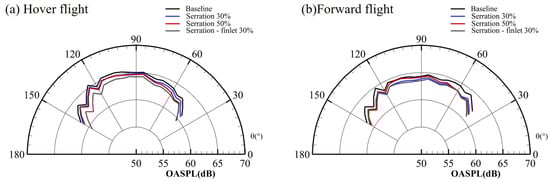 Lastly, Figure 7 shows the OASPL directivity of the quadcopter at observer locations from the overhead array for the hover and forward flight conditions, respectively. Note that the results from the side array are not shown here for the sake of brevity, since they are similar to those from the overhead array. Also, it is useful to mention that the OASPL is integrated over a frequency range of 300 Hz ≤ f ≤ 20,000 Hz, meaning that it includes both tonal and broadband components. The amplitude of the OASPL hovered around 65 dB, indicating that the drone noise is clearly audible when it is approximately 2 m away. Importantly, the serration and serration–finlet modifications did not alter the directivity pattern in both the hover and forward flights. Therefore, its noise mitigation effect can be observed in all the observer locations, despite the fact that the magnitude of the reduction differs. Moreover, it further confirms that the serrations and serration–finlet, which mainly affect the broadband component in the mid-to-high frequencies, can yield a notable reduction even when the OASPL over the entire range of frequency is considered.