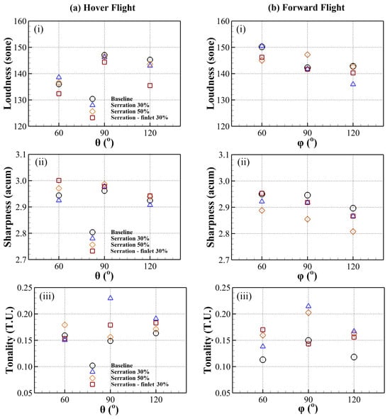 Sound quality metrics of (i) Loudness (ISO 532-3 [35]), (ii) Sharpness (DIN standard [36]), and (iii) Tonality (based on Aures weighting [37]) analyzed from the far-field acoustic signal for the drone at (a) hover flight and (b) forward flight using the baseline, serration-only, and serration–finlet blade designs. Three observer locations of 60°, 90°, and 120° are selected from the overhead microphone array to correspond to the acoustic spectra result in Figure 3 and Figure 5.