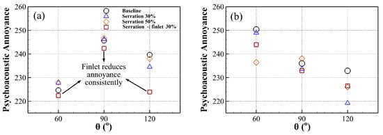Psychoacoustic annoyance from the drone noise taking into account of the contribution from all the sound quality metrics for (a) hover flight and (b) forward flight. Three observer angles of 60°, 90°, and 120° are selected from the top microphone array, similar to Figure 8, and the annoyance is calculated based on the psychoacoustic model in [22].