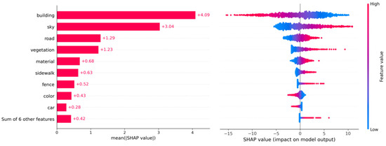 To further uncover the nonlinear effects and interaction relationships among factors influencing street quality, this study incorporates SHAP. SHAP results (Figure 7) show that the proportion of buildings has the most significant negative impact on street quality, contributing the highest negative value, consistent with the results from the elastic net regression model. The view of the sky, roads, and vegetation also demonstrate strong positive effects in the SHAP. Additionally, SHAP further reveals the importance of features such as material and color, which, despite having smaller regression coefficients, play critical roles in the perception of the street environment.