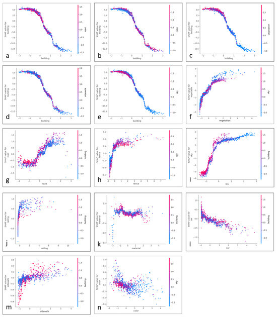SHAP dependency plot analysis further elucidated the complex interrelationships among these variables (Figure 8). The variable “building” exhibited a strong negative impact on street quality, with SHAP values decreasing sharply from approximately +5 to below −12 as the building proportion increased (Figure 8a–e). Meanwhile, the “sky” feature showed an opposite and strong positive effect, with SHAP values rising from about −6 to over +6 as sky visibility increased (Figure 8i). These patterns confirm the adverse impact of building density and the beneficial role of sky openness in shaping perceived street quality. “Vegetation” also demonstrated a clear positive contribution, especially under high-density conditions. SHAP values rose from near zero to approximately +3 as vegetation coverage increased, supporting its capacity to mitigate spatial enclosure and enhance comfort (Figure 8f). The effect of “road” showed a nonlinear relationship: moderate road proportions positively contributed to quality (peaking at approximately SHAP + 1.5), whereas extremely high or low proportions reduced effectiveness (Figure 8g). “Fence” and “railing” contributed positively to perceived safety and order, with SHAP values reaching over +1 when their proportions were within moderate ranges (Figure 8h,j). Conversely, “car” displayed a distinct negative effect, with SHAP values dropping from approximately +0.5 to below −1.5 as vehicle presence increased (Figure 8l). The “sidewalk” variable exhibited a saturation effect—SHAP values increased initially but plateaued at approximately +0.5 when sidewalk coverage became too large, possibly due to spatial limitations in narrow street environments (Figure 8m). The influence of “color” appeared relatively weak and scattered, with SHAP values fluctuating narrowly between −0.3 and +0.3 (Figure 8n), indicating its limited direct effect but potential contextual relevance in visual composition.