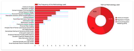 Figure 1 illustrates the frequency of different methodologies used in research related to sustainability, risk management, and financial performance, providing valuable insights into the preferred analytical approaches in the field. The analysis of specialized literature is the most frequently used methodology, representing 31.6% of the top five methods employed. This highlights the fundamental role of theoretical frameworks and previous studies in understanding the connection between sustainability, risk management, and financial performance. Regression analysis ranks second, representing 26.3% of the methods used, highlighting its importance in the quantitative exploration of the impact of sustainability and risk-related factors on financial results. The application of Content Analysis in Annual Reports at 15.8% indicated an increased reliance on corporate disclosures to evaluate sustainability practices and risk management strategies. Structural Equation Modeling (SEM), representing 13.2%, suggests a growing interest in understanding the complex relationship between latent variables, such as sustainability practices, risk management effectiveness, and financial performance.