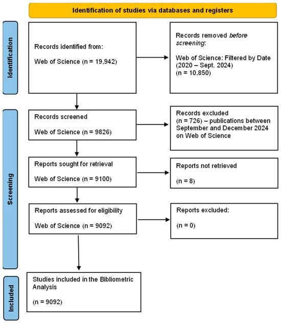 The PRISMA flow chart from Figure 3 illustrates the step-by-step process of selecting studies from Web of Science to conduct a bibliometric analysis using VOSviewer. The process follows standard systematic review and scoping review methodologies to ensure the selection of relevant studies while eliminating irrelevant or duplicate records. The initial search in Web of Science identified 19,942 records. To refine the dataset, 10,850 records were removed before screening by applying a date filter (2020–September 2024). This step ensures that only the most recent and relevant studies are included in the analysis. After removing irrelevant records, 9826 studies were screened, and 726 records were excluded as they were published between September and December 2024, which were outside the predefined cutoff period.