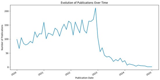 Figure 4 illustrates the evolution of publications over time from 2020 to 2025, showing fluctuations in the number of published works. There is a steady increase in publications from 2020 to early 2023, peaking at over 200 publications. However, a sharp decline follows in mid-2023, with publication numbers dropping significantly through 2024 and stabilizing at a lower level by 2025. This trend suggests a surge in research interest during the early years, followed by a decline, possibly due to shifts in academic focus interests or data collection limitations.