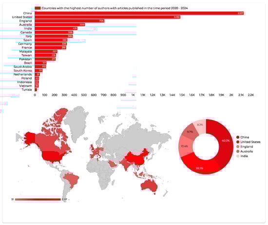 Countries with the highest number of authors with articles published in the time period 2020–September 2024. Source: authors’ processing in Tableau Public.