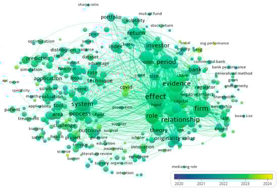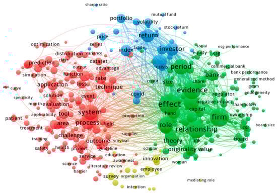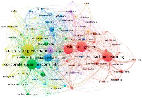 Figure 6 illustrates the diagram generated from the authors’ keywords, providing a visual representation of their interconnectedness. “Corporate governance”, “Risk management”, “Corporate social responsibility”, “Machine learning”, “COVID-19”, “Financial performance”, “Sustainability”, “Risk”, “Artificial intelligence” were the keywords that appeared the most common and were listed with the highest TLS (Total Link Strength).