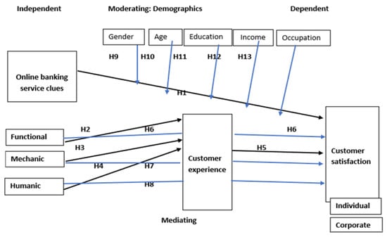 Gautam and Sah [70] supported this idea with their study, which revealed that website usability and features significantly influence customer satisfaction. Wasan [24] found that functional service clues related to credibility and convenience were most positively and significantly associated with customer satisfaction, while humanic clues followed. Mechanic clues, on the other hand, were primarily found to encourage customer behavior. Similarly, Ayinnadis et al. [71] highlighted the importance of functional clues in online banking, noting that focusing on these factors leads to increased customer satisfaction. Khan et al. [72] also discovered that improved online banking services contribute to customer satisfaction. Anouze et al. [73] pointed out that emotional factors, such as a sense of security, affect the adoption of online banking services, emphasizing that a strong feeling of security correlates with higher customer satisfaction. Park and Han [74] found that service clues influence the decision to use and continue utilizing a service. Likewise, Quiber [75] stressed the importance of security and reliability, identifying them as significant factors impacting customer satisfaction. Thus, our first hypothesis can be stated as follows: