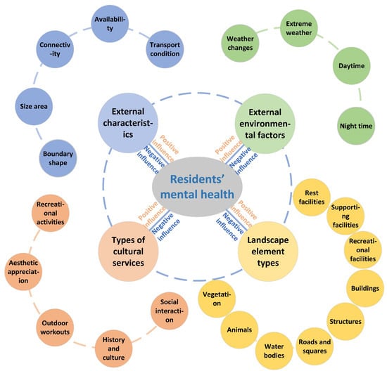 - Ha, J.; Kim, H.J.; With, K.A. Urban green space alone is not enough: A landscape analysis linking the spatial distribution of urban green space to mental health in the city of Chicago. Landsc. Urban Plan. 2022, 218, 104309. [Google Scholar] [CrossRef]