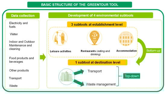 The tool proposed in this study, called the © 2021 Greentour tool, was developed under the framework of the project “Greentour: Circular Economy and Sustainable Tourism in Destinations of the SUDOE Space”. This project of the Interreg SUDOE Program, funded by the European Regional Development Fund (ERDF), addressed several innovative actions to define, evaluate, and modify strategies, balancing environmental, economic, and social value in the tourism sector. The Greentour tool encompasses three subtools focusing on the three tourism-related main sub-sectors: accommodation, eating and drinking, and leisure activities. In addition, it also entails a fourth subtool that determines the total environmental impacts at the destination level, including not only the three sub-sectors, but also waste management and the “origin-to-destination” transport of tourists. This latter subtool is based on an extrapolation of the impacts of a sample of touristic establishments in each sub-sector within the destination to the total population level (bottom-up approach). The bottom-up approach uses detailed, process-specific data collected from individual establishments in each sub-sector (e.g., accommodation, dining, leisure activities) to build an environmental inventory, which is then scaled up to estimate the total environmental impacts for the destination. This method is particularly useful when more granular data are available and when the goal is to assess localized, specific impacts. On the other hand, the top-down approach is applied for waste management and transport, where aggregated data or global models are used to estimate the environmental impacts. This approach provides a broader, more generalized perspective and is typically employed when individual-level data are difficult to obtain or when a higher-level overview of impacts is required. By using aggregated data or models, the top-down approach efficiently estimates impacts at the destination level. The bottom-up and top-down processes are shown in Figure 1, which illustrates the different sub-sectors analyzed [25].