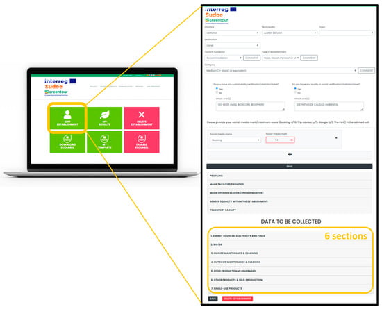Primary data needed to compile the inventory are collected through an online questionnaire, which is accessible through the establishment owner’s registration on the Greentour platform [26] (Figure 3). Users must register on the platform using a username and password to create a secure profile. Once registered, they can input and update data regarding the establishment, including general information such as its name, type, category, year of data collection, capacity, and days of operation, as well as details about its facilities, months of operation, and other relevant aspects. The platform ensures that all personal data are stored securely in compliance with data protection regulations, with access restricted to authorized personnel only. The questionnaire also includes a specific section for collecting environmental data, such as the generation and consumption of energy, water, cleaning products for maintenance, food, beverages, and other products used in leisure activities. All these inputs and emissions have been determined based on previous studies and assessments carried out in different establishments, in order to identify the key aspects to be considered according to the type of accommodation. The statistical basis of the data follows internationally recognized sustainability assessment methodologies, including the life cycle assessment [28,29] and the Product Environmental Footprint (PEF) method. In addition, the questionnaire is in line with standards for environmental reporting in tourism, allowing comparability between different establishments. The results of each establishment are presented in relation to other establishments in the same destination and other destinations analyzed, thus enabling a comparative assessment. To ensure the consistency and reliability of the data, several validation mechanisms have been implemented. Firstly, the questionnaire incorporates predefined ranges and reference values based on previous studies and current regulations. Internal checks are applied to detect discrepancies, and if any inconsistencies are found, the data are reviewed by technicians to verify their accuracy. The data validation process ensures the accuracy and reliability of the information before proceeding with the environmental impact assessment. These validation steps are in place to ensure that only high-quality, reliable data are used in the evaluation. In addition to these internal validation mechanisms, the questionnaire was pretested in the pilot destination of Lloret de Mar. This pilot phase allowed us to assess the reliability and consistency of the questions, as well as to identify any issues related to the clarity of the questions and the data obtained. The results from the pilot were analyzed to ensure that the questions effectively captured the necessary information and provided reliable data for the environmental impact assessment. The feedback from the pilot phase led to adjustments in the questionnaire, ensuring that it would be suitable for use in other destinations. Additionally, the platform’s secure data management system guarantees that all collected data are handled with confidentiality and in accordance with privacy protection standards.