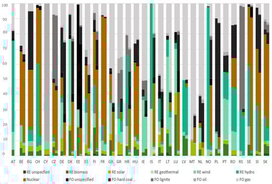 The country-specific residual electricity mix was modeled according to data from the Association of Issuing Bodies (AIB—https://www.aib-net.org/, accessed on 13 March 2025), which publishes national residual mixes for 32 European countries. The aim of the AIB is to develop, use, and promote a standardized energy certification system for energy carriers. The energy sources in the residual mixes were divided into three main categories: (i) renewable, including biomass, solar, geothermal, wind, hydro, and non-specific renewable; (ii) nuclear; and (iii) fossil, lignite coal, oil, gas, and non-specific fossil. Figure 4 shows the share of energy sources when comparing the production of the residual mixes. In this respect, the share of renewable energy is considerably lower for the residual mixes, while nuclear and fossil energy sources increase their share. The reason behind the latter is the extraction of renewable energy that is claimed and sold as GO at national or international levels.