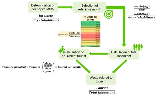 In this case, we employ an indirect method in which the generation of municipal waste is used to calculate, as a proxy, the total number of people staying in a location, including visitors who do not spend the night there. To employ this method, we evaluate the monthly generation of per capita MSW, taking as reference the month with the lowest amount of MSW. This criterion assumes that the reference month, with the lowest waste generation, had “no tourists”, with all waste being generated by permanent residents. In this sense, the total number of inhabitants is obtained by dividing the MSW quantity of each month by the reference per capita MSW. Additionally, the equivalent number of tourists is given by the difference between the total inhabitants per month and inhabitants in total.
