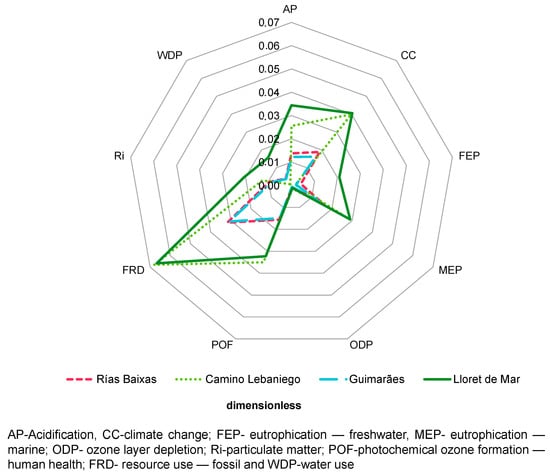 Tourism tends to generate impacts in areas such as climate change, water use, and waste generation, while toxicity tends to be more related to intensive industrial processes. Moreover, four other impact categories were also excluded (ionizing radiation, eutrophication terrestrial, land use, and resource use: minerals and metals) because they are not very relevant to the tourism sector [39].