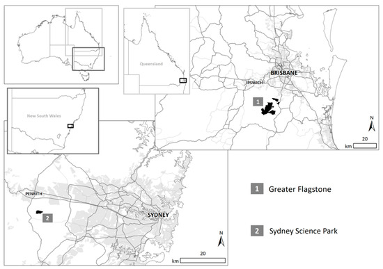 The two case study projects, as depicted in Figure 1, were Greater Flagstone in Logan (near Brisbane) and Sydney Science Park in Penrith (Western Sydney). While the former is a much larger development than the latter, they share many similarities (e.g., being in the early stages of planning and design; being located in an identified urban growth area; the rural context requiring innovation in the urban infrastructure provision; and involving the active engagement of diverse stakeholders from across the industry). Both are greenfield sites located approximately 40 km from the nearest CBD—Greater Flagstone to the southwest of Brisbane (in the state of Queensland) and Sydney Science Park to Sydney’s west (in the state of New South Wales). These sites were chosen to represent different scales of development and governance. Greater Flagstone is 7188 hectares with a state government agency overseeing its development. In contrast, Sydney Science Park is a 287-hectare site that is being developed by a private developer. Further details of these case study sites are available in Quezada et al. [48].