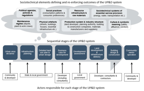 Using real urban development projects as case studies enables the identification of multiple and diverse actors from across the industry who can relay their insights and experiences about the same development project. For each case study, data were captured using both semi-structured interviews and workshops that allowed for the iterative learning required to capture the complexity of the UP&D system. A key input into these data collection processes was the development of a conceptualization of the UP&D system. This conceptualization was prepared based on previous research experience and a review of the literature. The UP&D system was defined as comprising a diversity of actors and knowledge domains that interacted with the sequential stages of the UP&D process within the broader context of a variety of socio-technical influences, such as culture, politics, technology, and resources (Figure 2).